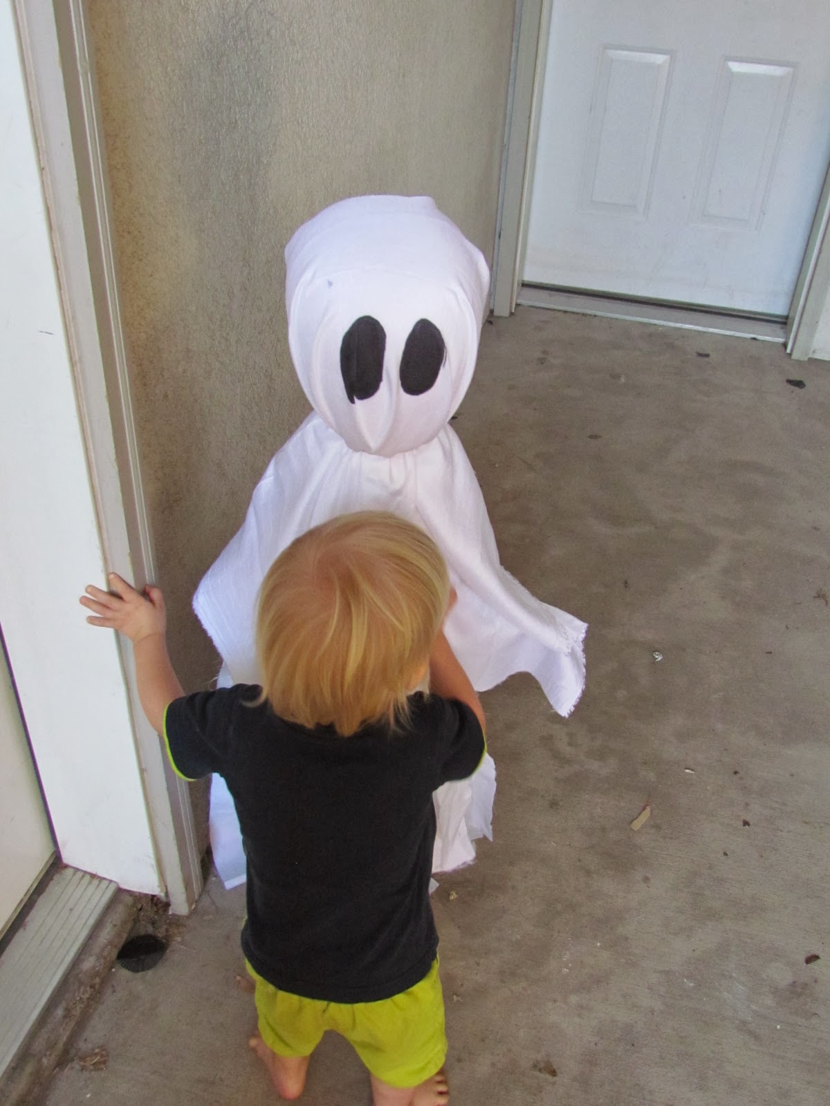 Use a permanent marker, or paint, to add some long spooky eyes and voila! Prince L has had a blast running up to the ghost trying to knock it down, while saying “Ooooo ooooo”