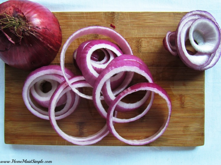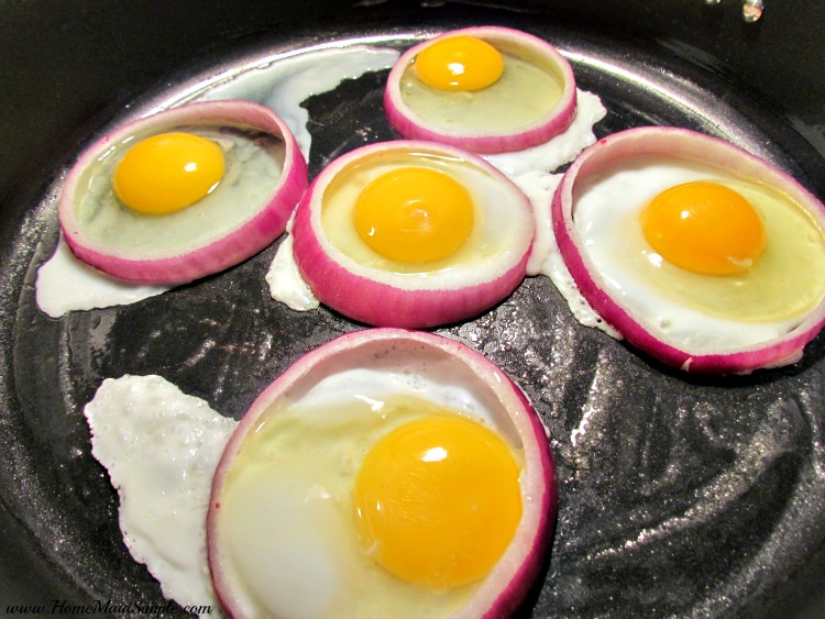 While the rice cooked, I whipped up some Minion Goggles with eggs and a purple onion. To do this slice your onion 1/4-1/2 inch thick. Fry in a little butter on a non-stick cooking pan, on both sides for about 30 seconds per side. You still want them stiff, but not raw. Crack an egg into each onion slice, cover, and cook through.