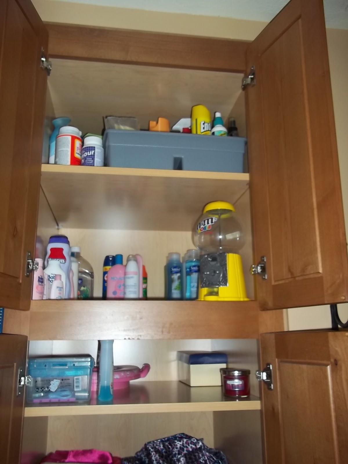 This is the top half of the kids/guest closet. Even I have to use a stool to reach the top, so I decided instead of crowding under the kitchen sink, I could store all the cleaning supplies up here. There is no way the Princess’ are going to get into those. And then of course our stock pile of lotions, shampoos, and potty training reward jar (empty yes, it hasn’t been used for awhile).