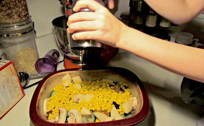 One of the fun things about this dish, was because of it’s ease to put together, I was able to recruit some help in the kitchen from Princess V. She had a rough day and needed some special time with just mom and her attention.  Before we tossed everything in the baking dish, we decided to try out my new Salt and Pepper Grinder from Ozeri. I have never owned a grinder, but I recall how fun they were as kid to twist.